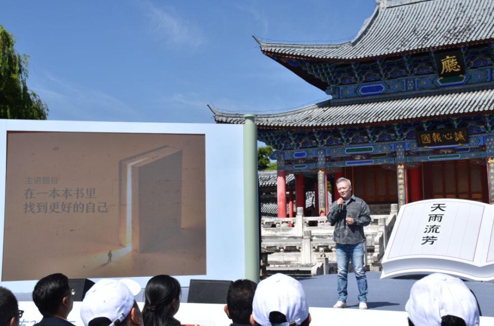 知名閱讀推廣人韓偉以《在一本本書里,找到更好的自己》為題進(jìn)行閱讀分享。(麗江融媒記者 楊四娟 攝)