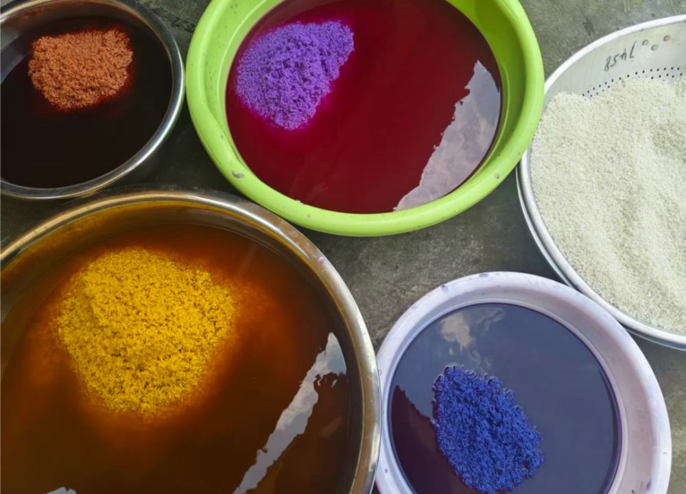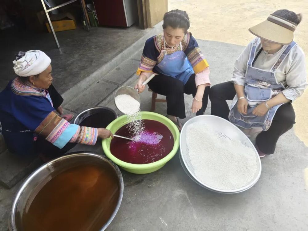 布依群眾把從山上采摘來(lái)的植物染料搗碎,再經(jīng)熬煮、過(guò)濾,得到純凈的天然染汁,不同顏色的染料需用不同溫度慢慢煨煮,每一步都講究火候與耐心。優(yōu)質(zhì)糯米洗凈瀝干后,放入染汁中浸泡2至3小時(shí),讓色彩浸透米質(zhì)。最后,將各色糯米鋪入木蒸子,大火蒸制1小時(shí)至熟,開(kāi)甑瞬間,粒粒分明,五彩米粒晶瑩剔透,草木清香與糯米甜香交織,沁人心脾。