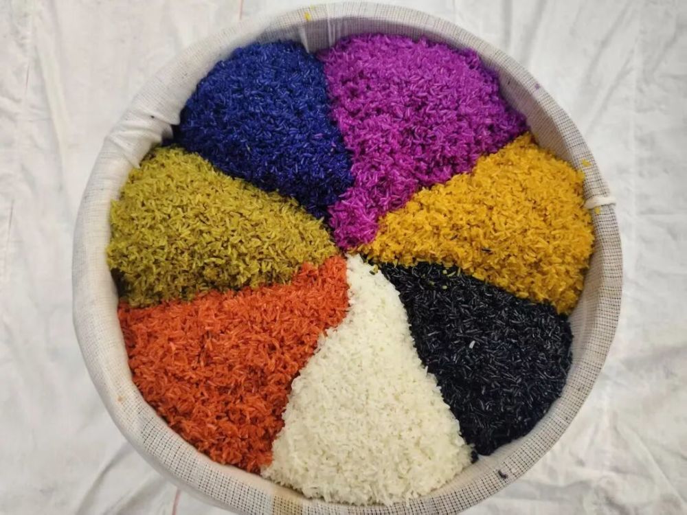 魯布革染花米飯歷史悠久、遠(yuǎn)近聞名。五彩花飯之鄉(xiāng)、五彩花飯制作技藝已被列入曲靖市非物質(zhì)文化遺產(chǎn)代表性項(xiàng)目,承載著布依族的農(nóng)耕智慧。傳統(tǒng)五色花米飯(黑、黃、紫、紅、白)源于自然饋贈(zèng),色彩來(lái)自不同染料:黑色楓香葉、黃色密蒙花、紫色紫藍(lán)草、紅色紅藍(lán)草,搭配糯米本色,構(gòu)成“五行五?!钡募樵⒁?。在當(dāng)?shù)厝罕姷膭?chuàng)新下,增加藍(lán)、綠兩色花米飯,全部采用天然植物染料。