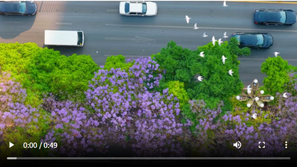云南省昆明市官渡區(qū),飛鳥飛過藍花楹(視頻截圖)。