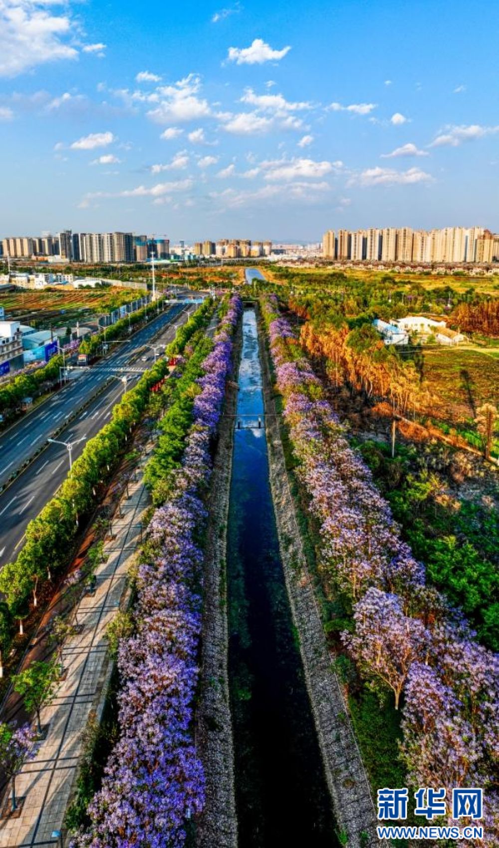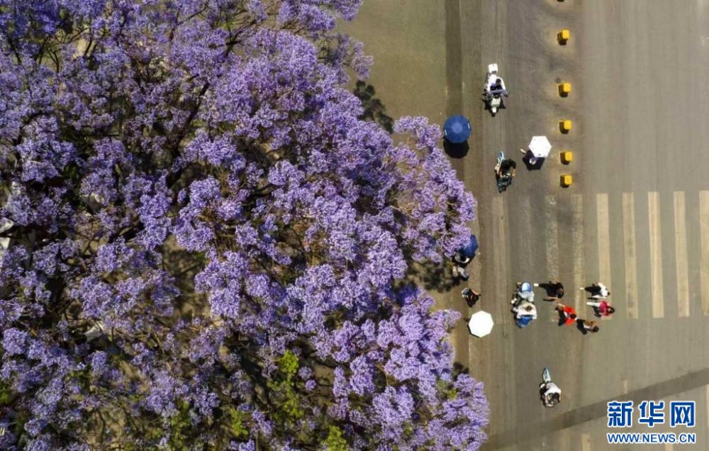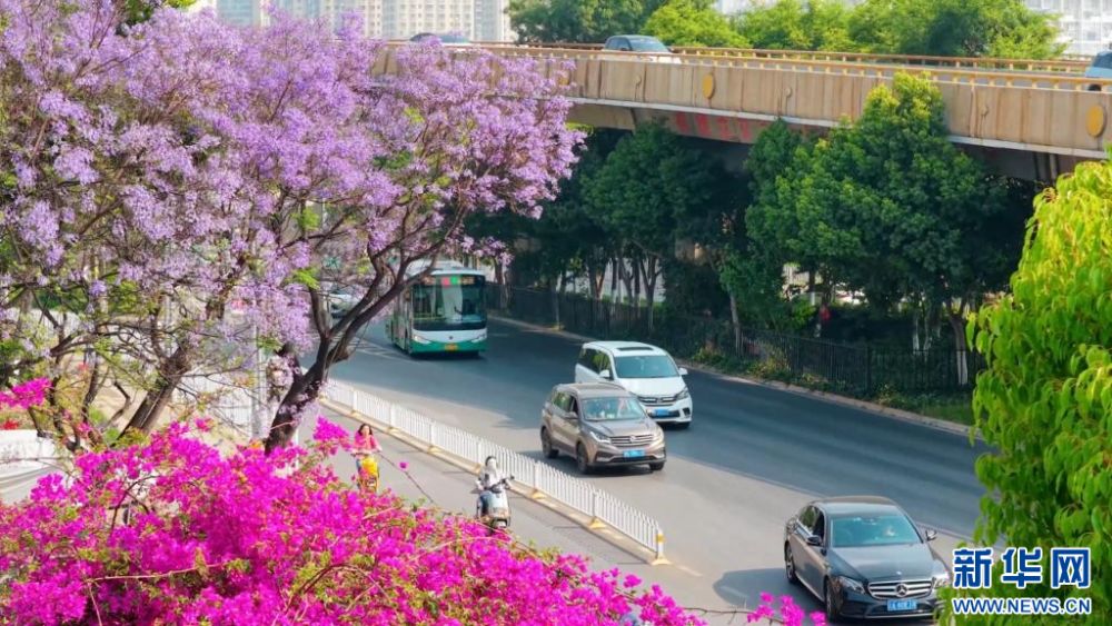 云南省昆明市官渡區(qū),藍花楹扮靚城市(4月17日攝)。新華網(wǎng)發(fā)(郭武輝 攝)