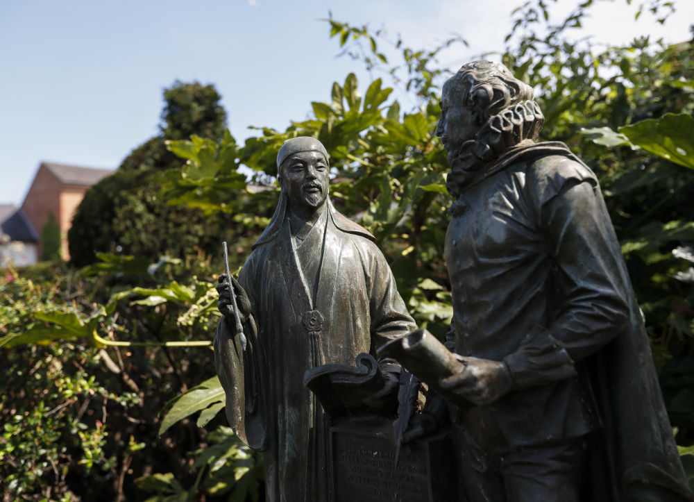 ??2022年4月20日在英國斯特拉特福拍攝的莎士比亞和湯顯祖的青銅塑像。新華社記者 韓巖 攝