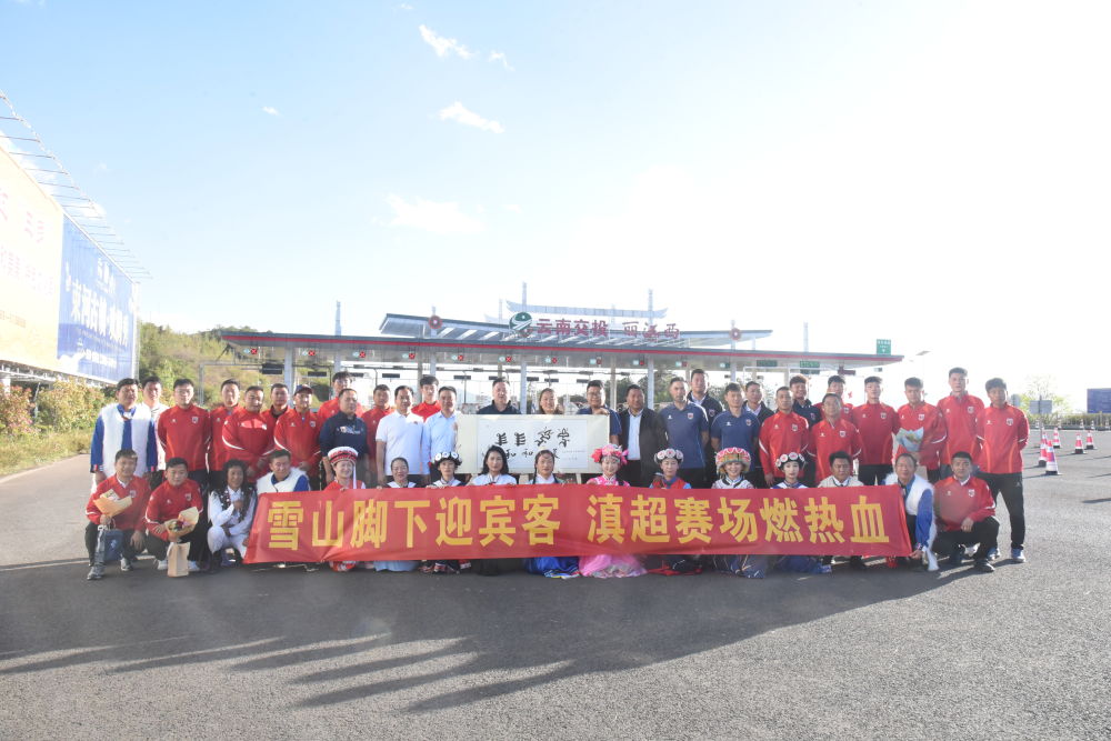 為迎接遠(yuǎn)道而來的客隊(duì),麗江相關(guān)部門在麗江西高速路口舉行熱烈歡迎儀式,工作人員以特色民族歌舞迎接怒江隊(duì)全體將士,同時(shí)為球員送上東巴字畫、特色文創(chuàng)禮品。隊(duì)員們還受邀參與民族打跳活動(dòng),近距離感受麗江濃郁獨(dú)特的民族風(fēng)情。
