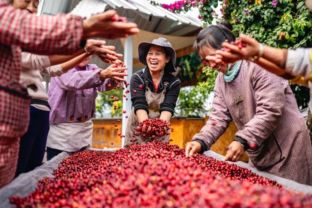 2025年1月8日,在云南省普洱市思茅區(qū)天玉咖啡莊園,莊園經營者和工作人員慶祝咖啡豐收。新華社記者 胡超 攝