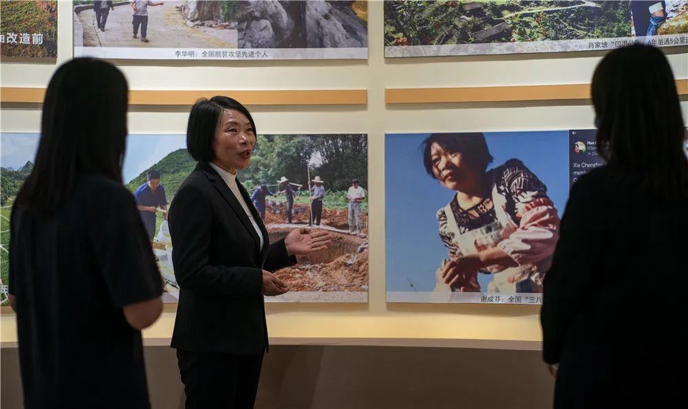黨的二十大代表謝成芬在西疇縣“西疇精神”展覽館里講述治理石漠的故事。新華社記者 江文耀 攝