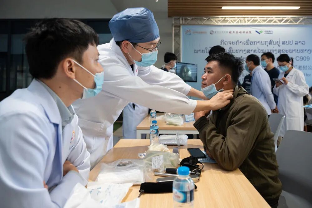 2月9日,復(fù)旦大學(xué)附屬眼耳鼻喉科醫(yī)院醫(yī)療團(tuán)隊在老撾萬象瑪霍索綜合醫(yī)院義診。新華社發(fā)(凱喬攝)