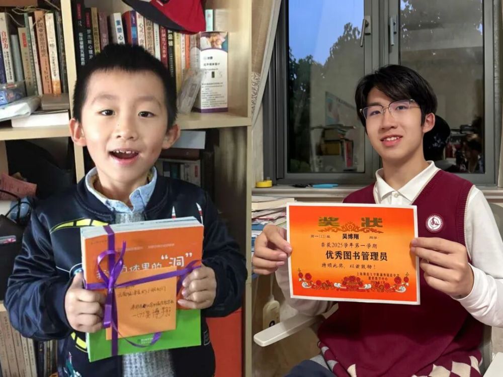 拼版照片:左圖為2016年吳博翔與捐贈的圖書合影;右圖為2026年吳博翔與“優(yōu)秀圖書管理員”獎狀合影。
